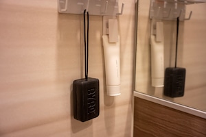 最小限のパッケージ、石鹸置き不要でシンプル、使用後のロープはリーシュコードへ