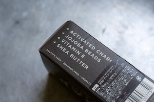 パーム酸ナトリウム、ココ酸ナトリウム、水、グリセリン、香料、塩化ナトリウム、炭、ホホバ種子油、ヒマシ油、クエン酸、シアバター、カラスムギ穀粒粉、トコフェロール(ビタミンE)